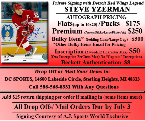 . Steve Yzerman - July Private Signing. DC SPORTS is the leader in Sports Memorabilia Autograph Signings in the Detroit area and beyond. Aidan.